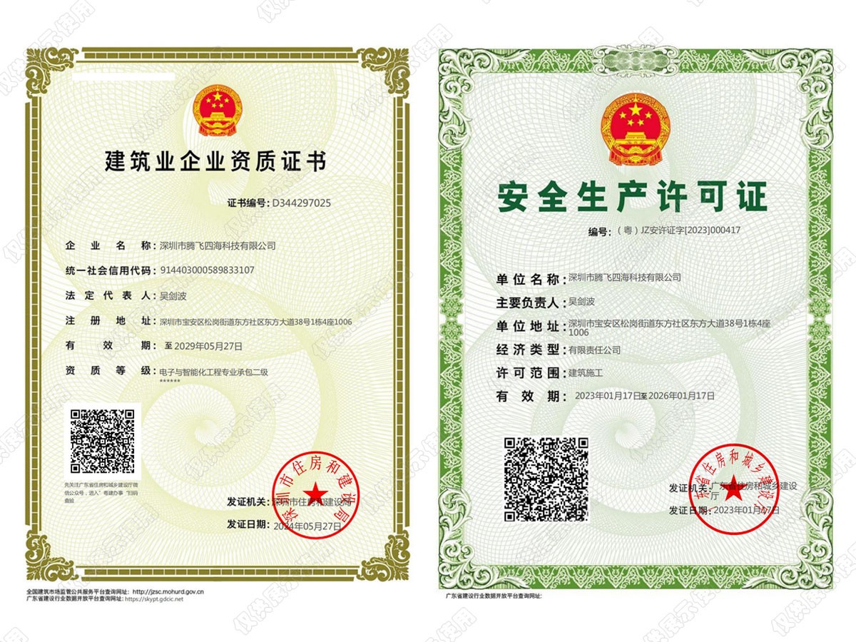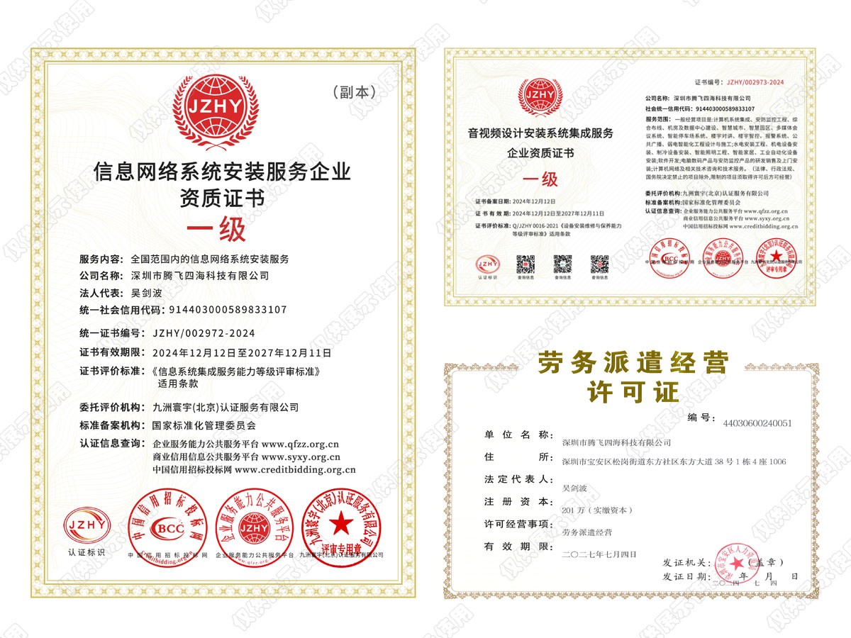 深圳市腾博会·诚信为本,专业服务_官方网站 科技有限公司专注现代化企业信息建设,争做国内互联网与安防领域的领导者。作为一家拥有自主知识产权的国家高新技术企业,在成立之初便坚持从用户的实际需求出发,以质量求发展,以信誉求生存。历经15年的风雨路程,如今,我们已荣获电子与智能化专业承包资质、广东省公安厅安防资质、安全生产许可证资质、计算机信息系统集成等多项资质。截止目前公司已通过:ISO9001质量管理体系认证,ISO14001环境管理体系和ISO45001职业健康安全管理体系;荣获AAA资信认证、实用新型专利证书、计算机软件著作权登记证书。公司现为深圳市安防协会理事单位,深圳市文明诚信企业,广东省“守合同重信用”企业、深圳市政府采购中心供应商等多个荣誉证书。